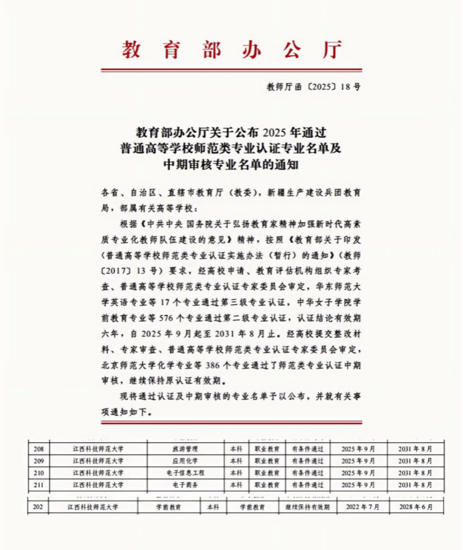 近日,教育部办公厅发布了《关于公布2025年通过普通高等学校师范类专业认证专业名单及中期审核专业名单的通知》(教师厅函(2025〕18号)。我校旅游管理、应用化学、电子信息工程、电子商务4个职业技术师范教育专业...