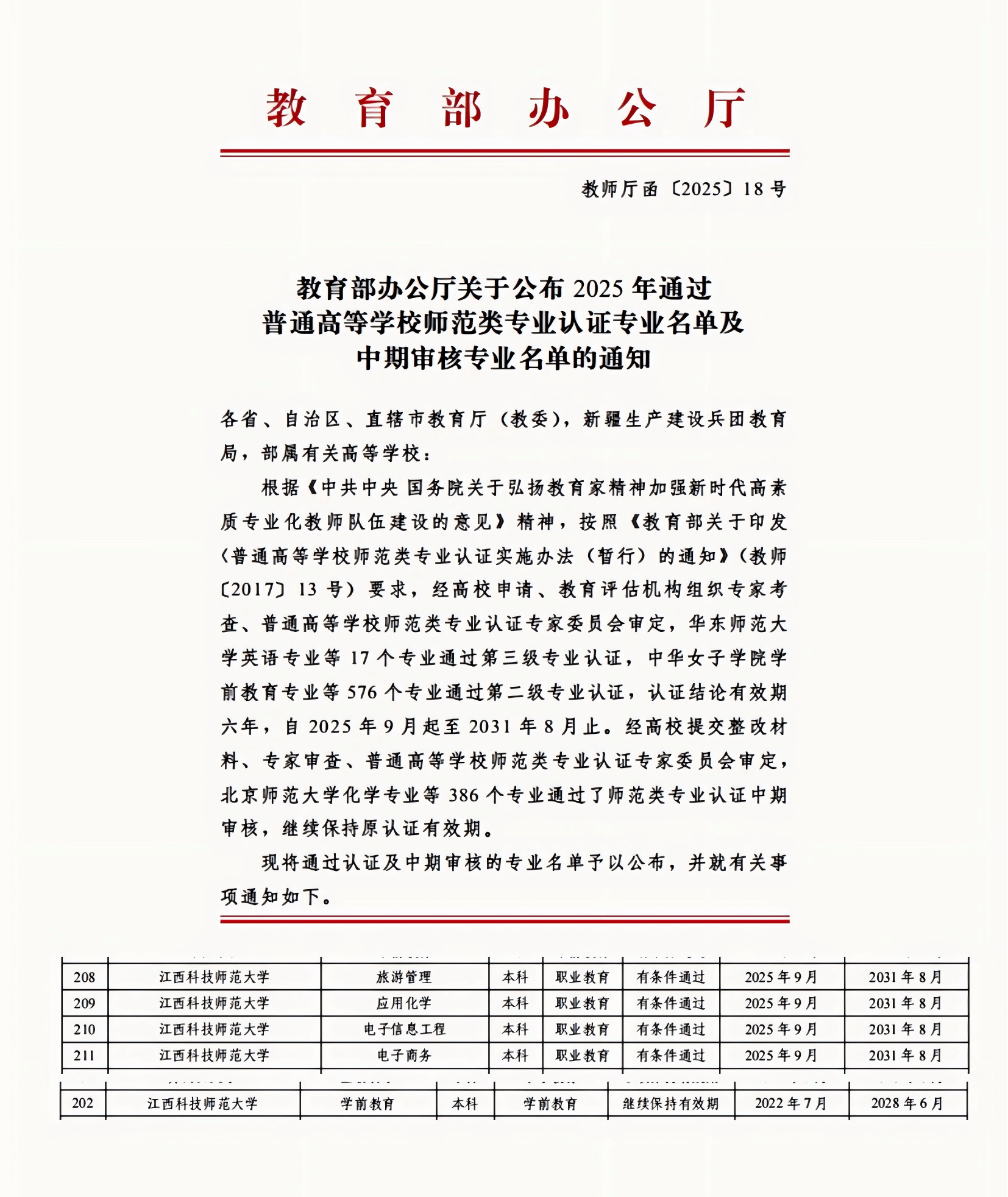 近日,教育部办公厅发布了《关于公布2025年通过普通高等学校师范类专业认证专业名单及中期审核专业名单的通知》(教师厅函(2025〕18号)。我校旅游管理、应用化学、电子信息工程、电子商务4个职业技术师范教育专业通过师范类专业第二级认证。学前教育专业通过师范类专业认证中期审核,继续保持有效期至2028年6月。